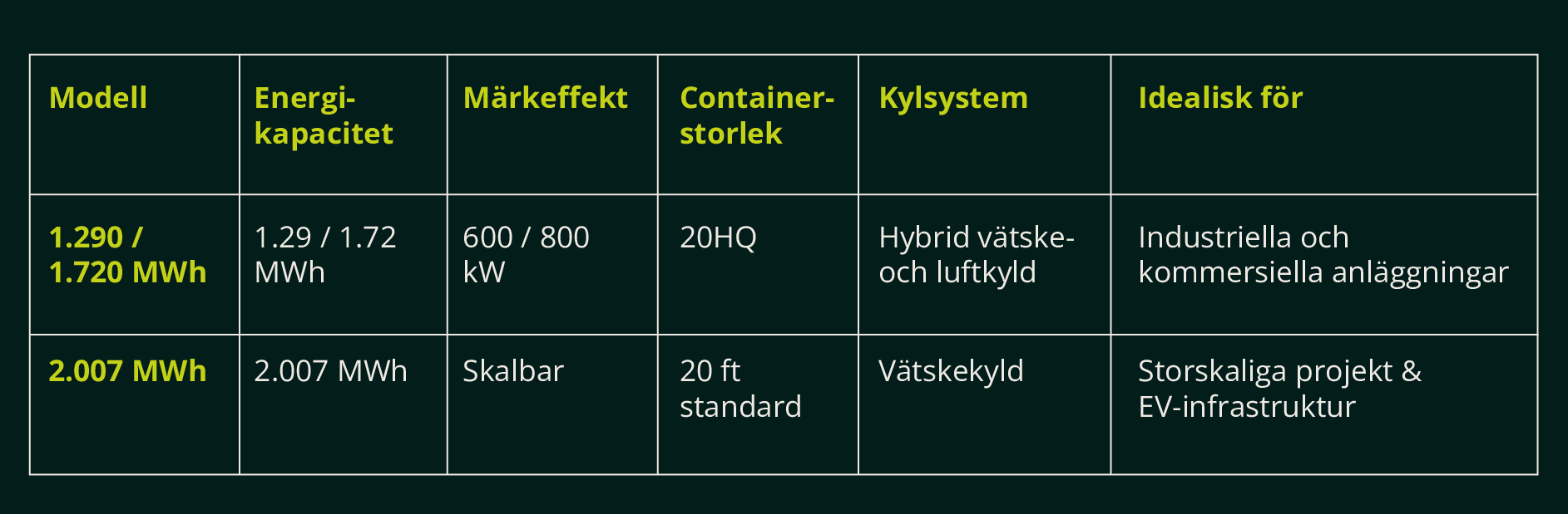Med kapaciteter från 1,29 till över 2,0 MWh täcker serien ett brett spektrum av användningsområden – från enskilda kommersiella anläggningar till stora energiprojekt på nätverksnivå.