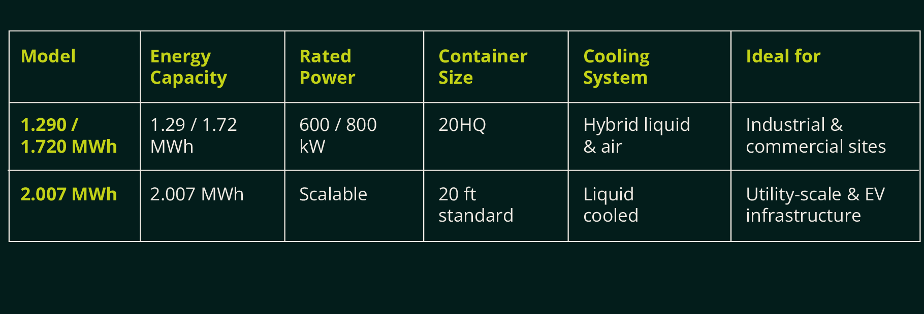 With capacities ranging from 1.29 to over 2.0 MWh, the series covers a wide range of applications — from single-site commercial setups to large utility projects.